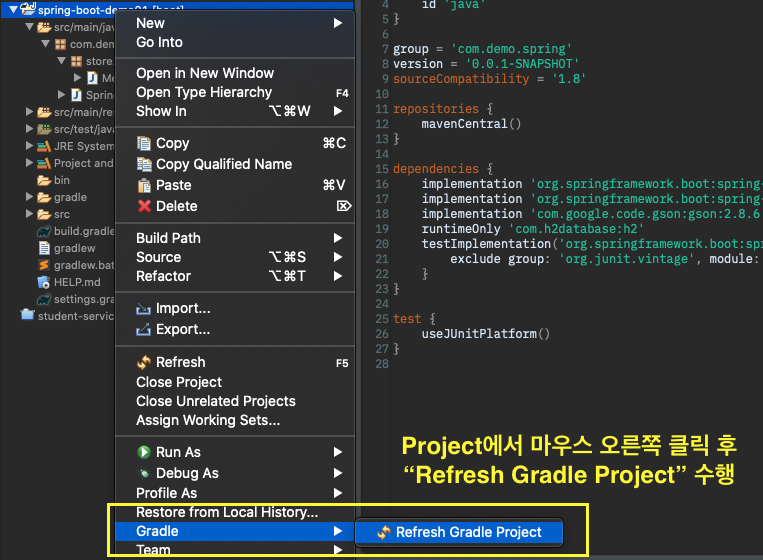 build.gradle을 변경한 후에는 항상 "Refresh Gradle Project"를 수행하여야 변경된 dependency나 build rule등이 적용됩니다. 따라서 아래와 같이 Project를 refresh 해줍니다.