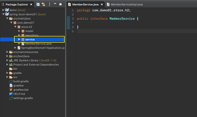 본 프로젝트에서는 Service부분에 구현할 내용이 거의 없으나 예제삼아 추가해 보도록 하겠습니다.