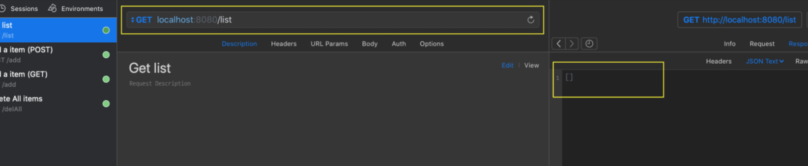 ● 최초 조회 : http://localhost:8080/list 요청 시 아래의 그림과 같이 Empty Array가 반환되면 정상입니다.