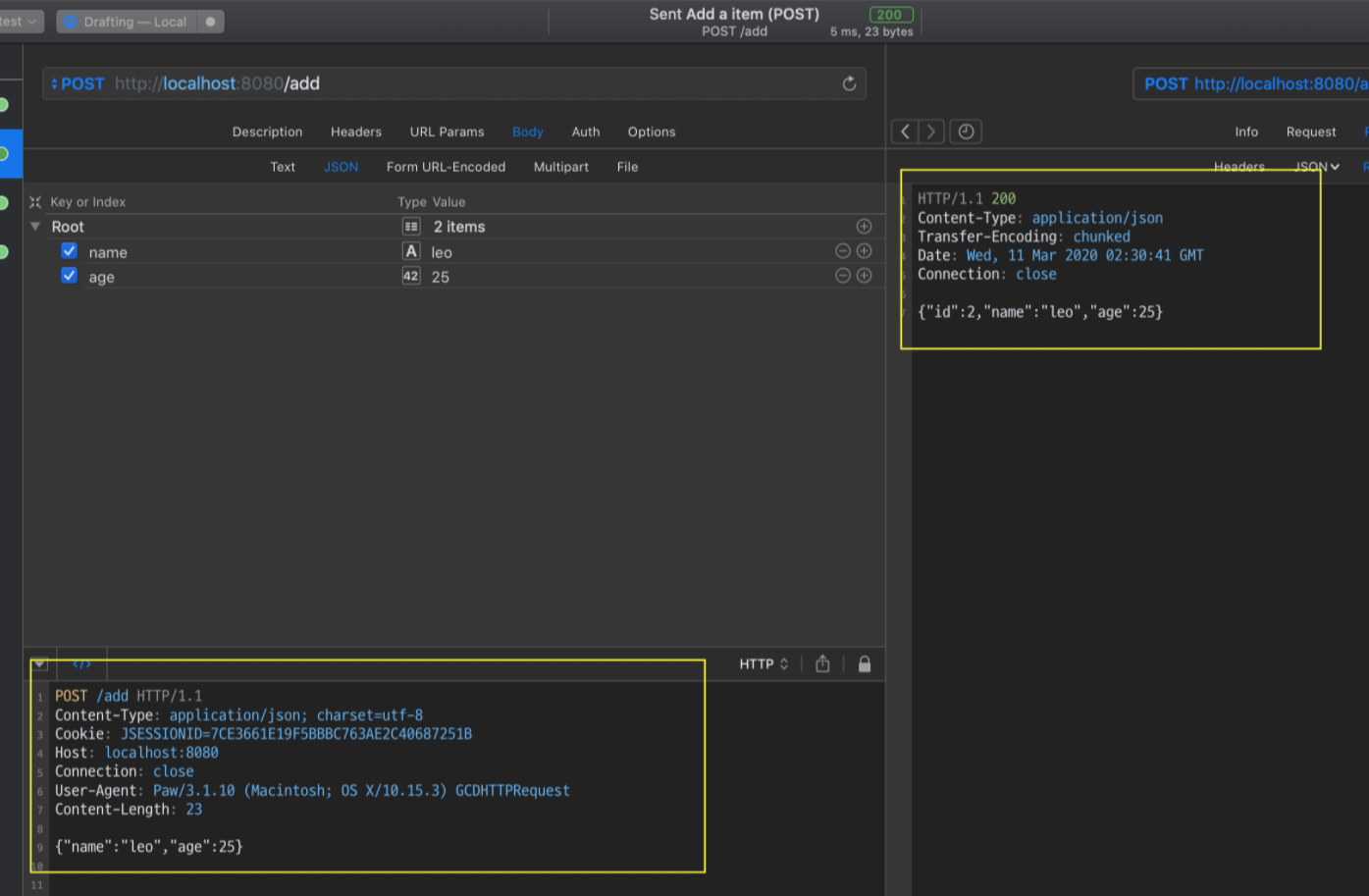 Controller까지 구현이 완료되었으므로 프로젝트 실행 후 테스트를 진행해보도록 하겠습니다. GET방식의 API만 있다면 Browser에서 테스트를 진행하셔도 무방하지만 추가하는 부분을 POST방식으로 구현하였기 때문에 HTTP Client를 사용하여 테스트를 진행하시는 것이 좋습니다. 보유하고 계신 (없다면 Postman 추천) HTTP Client 프로그램을 사용하여 추가, 조회, 삭제 테스트를 진행하면 다음과 같습니다.