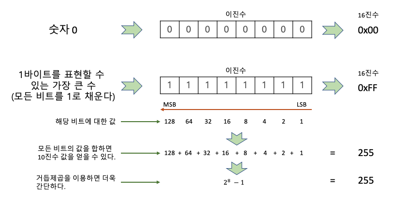 일단 부호가 없는(unsigned) 숫자일 경우를 생각해보면 8비트까지 표현할 수 있으므로 2^8(2의 8승)의 수를 표현할 수 있습니다. 2의 8승은 256입니다만 그렇다고 256까지 표현할 수는 없습니다. 이유는 0이 포함되어져 있기 때문입니다. 따라서, 1바이트 정수형은 0 ~ 255(256 -1)까지의 수를 표현할 수 있습니다. 이해가 되셨나요? 이를 이진수로 풀어보면 아래와 같을 것입니다.
