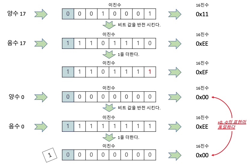 이로써 2의 보수 표현식을 사용하면 1바이트 정수형 값의 범위는 -128 ~ 127까지 표현할 수 있게 되며 2바이트, 4바이트, 8바이트의 정수 변수도 동일한 방법으로 표현 범위를 예측할 수 있습니다.